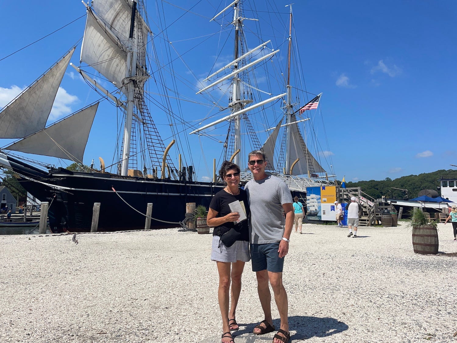 That’s us playing tourist on a selfie spot in Mystic, Connecticut, this past summer. We’re in front of the last wooden whaling ship in the world at a very cool seaport museum.