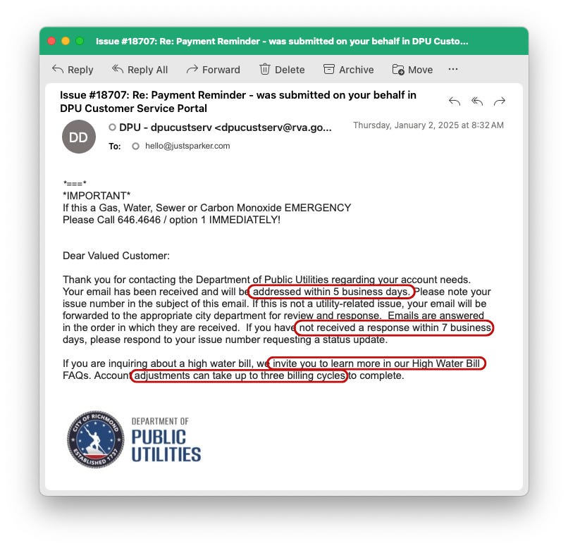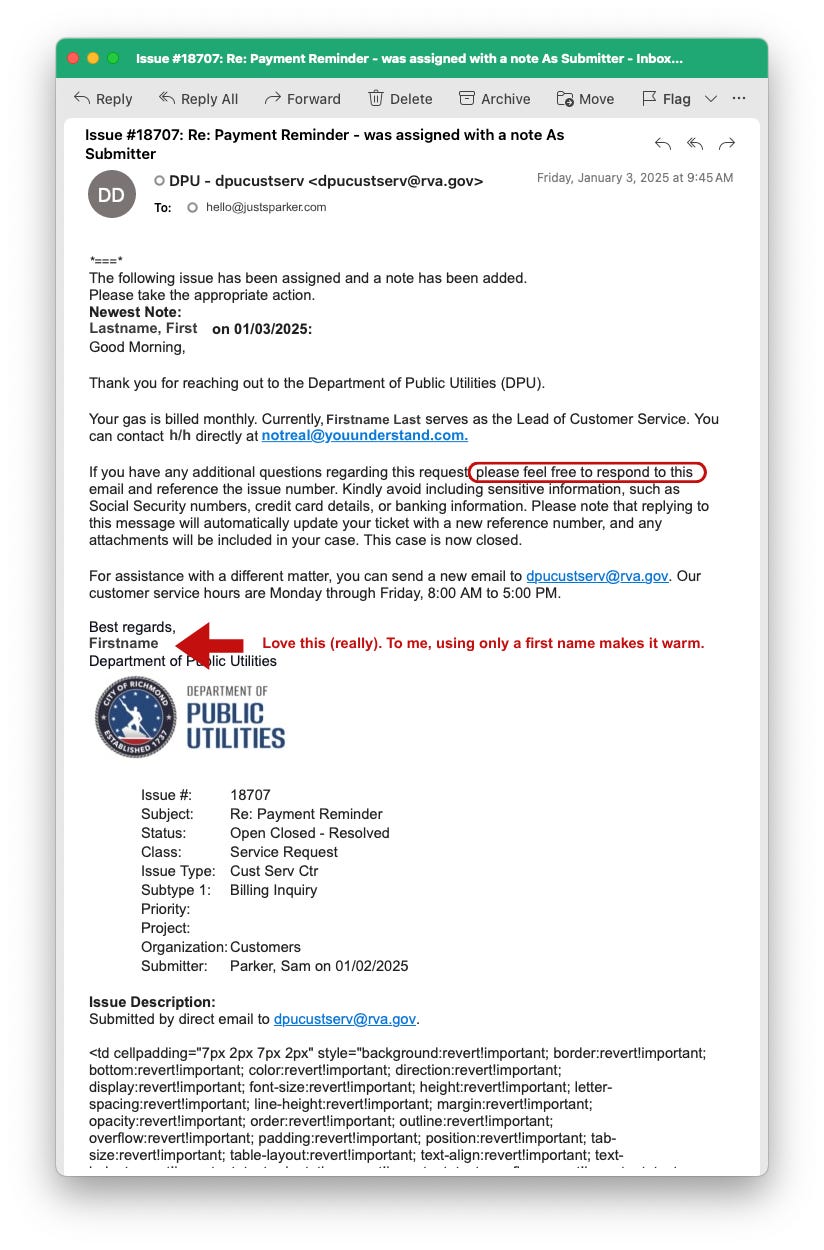 Occasionally, I’ll try to be a good citizen—a part of the solution. Challenge is my local government rarely makes it easy and fast to connect with a named human. Too many organizations do this in addition to not genuinely acknowledging people.2