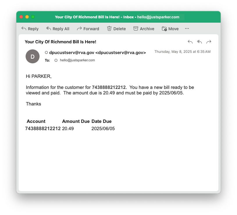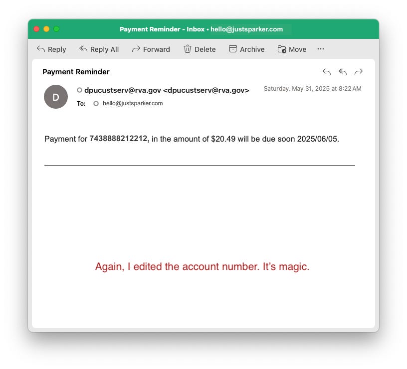 That’s a reminder email to pay my gas bill. It doesn’t say it’s for gas but I think it is. This was the follow-up a few weeks later—